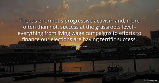 Hightower, Jim. (2026, January 16). There's enormous progressive activism and, more often than not, success at the grassroots level - everything from living wage campaigns to efforts to finance our elections are having terrific success. FixQuotes. https://fixquotes.com/quotes/theres-enormous-progressive-activism-and-more-89832/