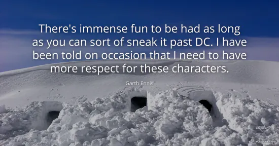 Ennis, Garth. "There's immense fun to be had as long as you can sort of sneak it past DC. I have been told on occasion that I need to have more respect for these characters." FixQuotes. January 15, 2026. https://fixquotes.com/quotes/theres-immense-fun-to-be-had-as-long-as-you-can-164692/.