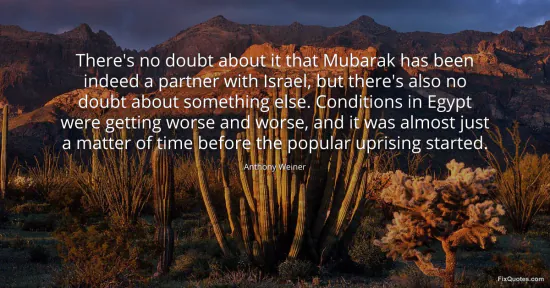 Weiner, Anthony. "There's no doubt about it that Mubarak has been indeed a partner with Israel, but there's also no doubt about something else. Conditions in Egypt were getting worse and worse, and it was almost just a matter of time before the popular uprising started." FixQuotes. January 17, 2026. https://fixquotes.com/quotes/theres-no-doubt-about-it-that-mubarak-has-been-63549/.
