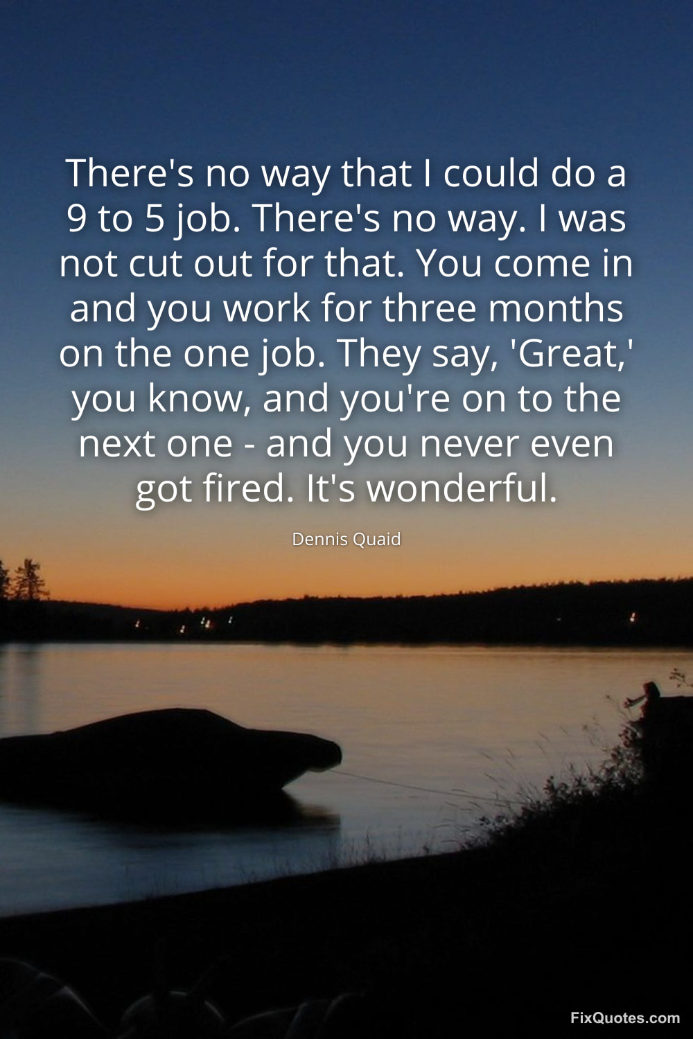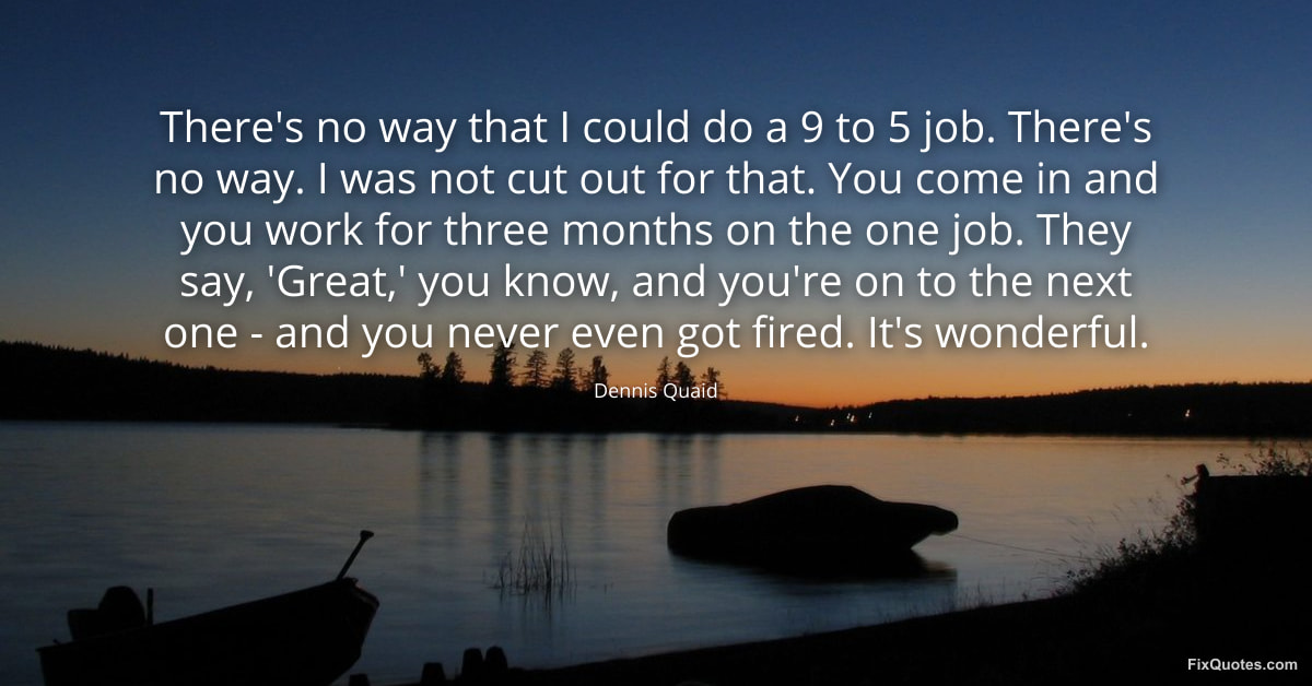 Quaid, Dennis. "There's no way that I could do a 9 to 5 job. There's no way. I was not cut out for that. You come in and you work for three months on the one job. They say, 'Great,' you know, and you're on to the next one - and you never even got fired. It's wonderful." FixQuotes. January 15, 2026. https://fixquotes.com/quotes/theres-no-way-that-i-could-do-a-9-to-5-job-theres-161228/.
