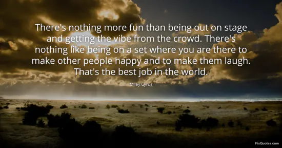 Cyrus, Miley. (2026, January 17). There's nothing more fun than being out on stage and getting the vibe from the crowd. There's nothing like being on a set where you are there to make other people happy and to make them laugh. That's the best job in the world. FixQuotes. https://fixquotes.com/quotes/theres-nothing-more-fun-than-being-out-on-stage-73695/