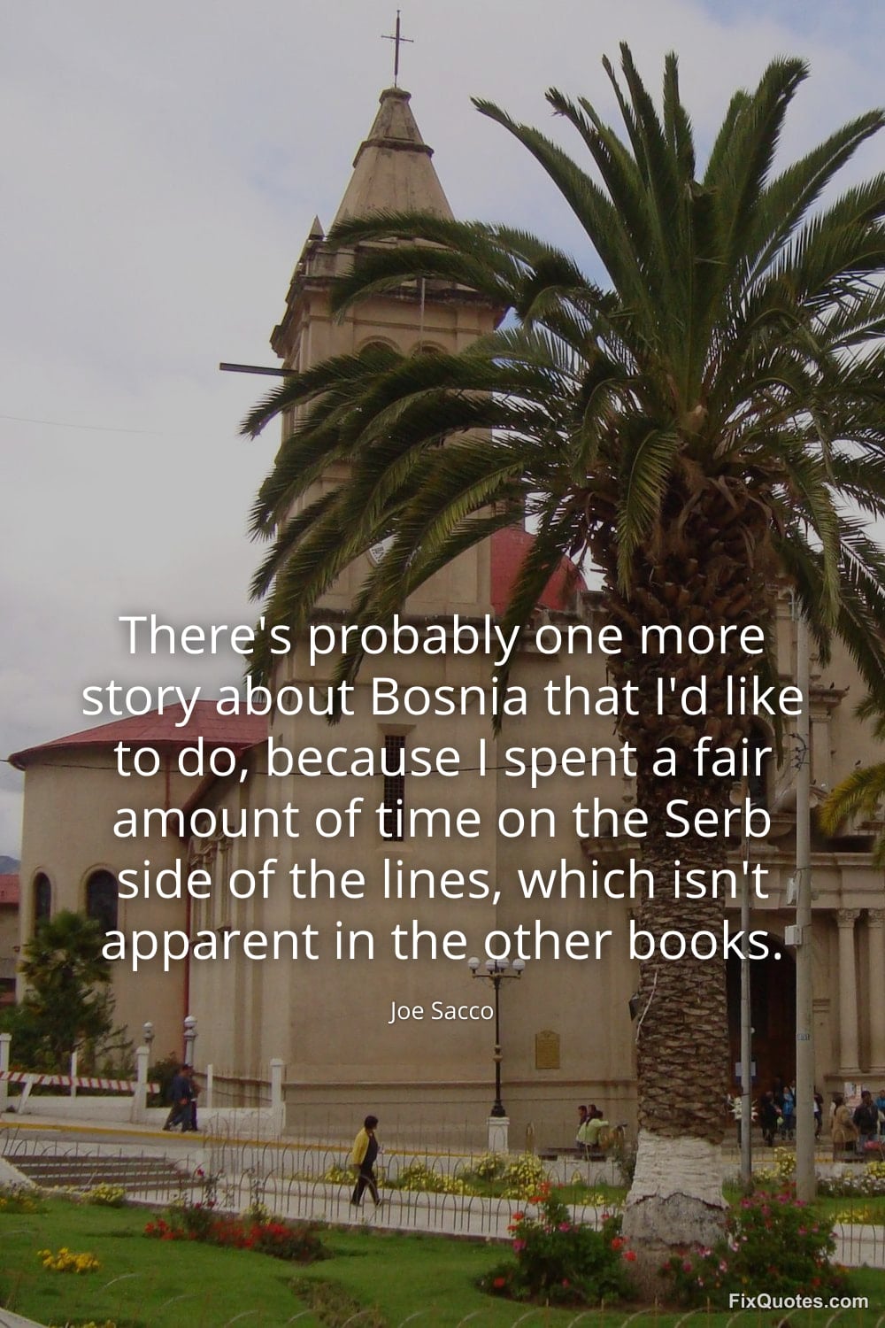 Sacco, Joe. (2026, January 16). There's probably one more story about Bosnia that I'd like to do, because I spent a fair amount of time on the Serb side of the lines, which isn't apparent in the other books. FixQuotes. https://fixquotes.com/quotes/theres-probably-one-more-story-about-bosnia-that-117787/