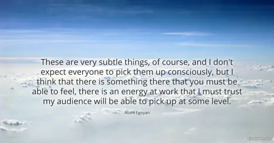 Egoyan, Atom. "These are very subtle things, of course, and I don't expect everyone to pick them up consciously, but I think that there is something there that you must be able to feel, there is an energy at work that I must trust my audience will be able to pick up at some level." FixQuotes. January 17, 2026. https://fixquotes.com/quotes/these-are-very-subtle-things-of-course-and-i-dont-39971/.