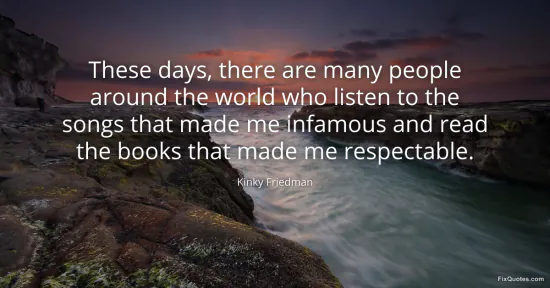 Friedman, Kinky. (2026, January 14). These days, there are many people around the world who listen to the songs that made me infamous and read the books that made me respectable. FixQuotes. https://fixquotes.com/quotes/these-days-there-are-many-people-around-the-world-150688/