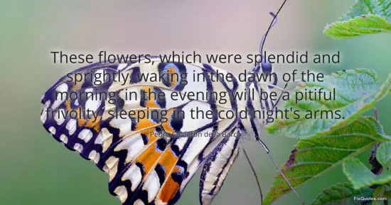 "These flowers, which were splendid and sprightly, waking in the dawn of the morning, in the evening will be a pitiful frivolity, sleeping in the cold night's arms." FixQuotes, 16 Jan. 2026, https://fixquotes.com/quotes/these-flowers-which-were-splendid-and-sprightly-85704/. Accessed 13 Feb. 2026.