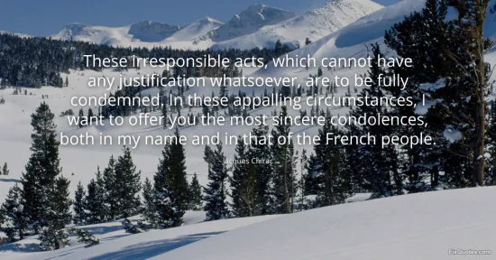 Chirac, Jacques. (2026, January 16). These irresponsible acts, which cannot have any justification whatsoever, are to be fully condemned. In these appalling circumstances, I want to offer you the most sincere condolences, both in my name and in that of the French people. FixQuotes. https://fixquotes.com/quotes/these-irresponsible-acts-which-cannot-have-any-112602/