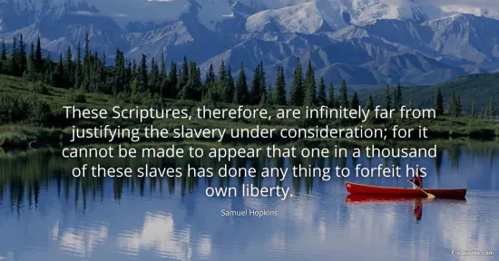 Hopkins, Samuel. "These Scriptures, therefore, are infinitely far from justifying the slavery under consideration; for it cannot be made to appear that one in a thousand of these slaves has done any thing to forfeit his own liberty." FixQuotes. January 15, 2026. https://fixquotes.com/quotes/these-scriptures-therefore-are-infinitely-far-166621/.