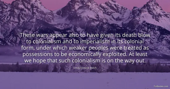 Balch, Emily Greene. (2026, January 15). These wars appear also to have given its death blow to colonialism and to imperialism in its colonial form, under which weaker peoples were treated as possessions to be economically exploited. At least we hope that such colonialism is on the way out. FixQuotes. https://fixquotes.com/quotes/these-wars-appear-also-to-have-given-its-death-148901/