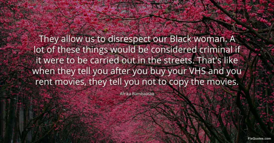 Bambaataa, Afrika. "They allow us to disrespect our Black woman. A lot of these things would be considered criminal if it were to be carried out in the streets. That's like when they tell you after you buy your VHS and you rent movies, they tell you not to copy the movies." FixQuotes. February 19, 2026. https://fixquotes.com/quotes/they-allow-us-to-disrespect-our-black-woman-a-lot-38506/.