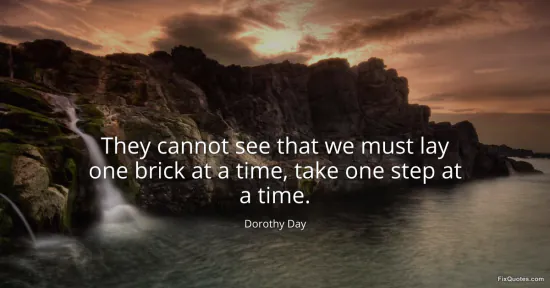 Day, Dorothy. "They cannot see that we must lay one brick at a time, take one step at a time." FixQuotes. January 15, 2026. https://fixquotes.com/quotes/they-cannot-see-that-we-must-lay-one-brick-at-a-143717/.