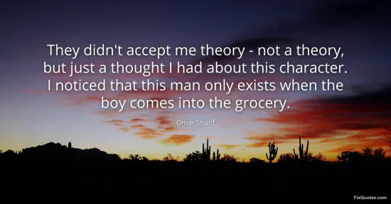 Sharif, Omar. "They didn't accept me theory - not a theory, but just a thought I had about this character. I noticed that this man only exists when the boy comes into the grocery." FixQuotes. January 16, 2026. https://fixquotes.com/quotes/they-didnt-accept-me-theory-not-a-theory-but-85182/.