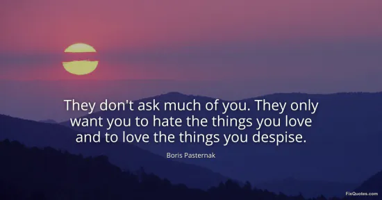 Pasternak, Boris. (2026, January 15). They don't ask much of you. They only want you to hate the things you love and to love the things you despise. FixQuotes. https://fixquotes.com/quotes/they-dont-ask-much-of-you-they-only-want-you-to-7171/