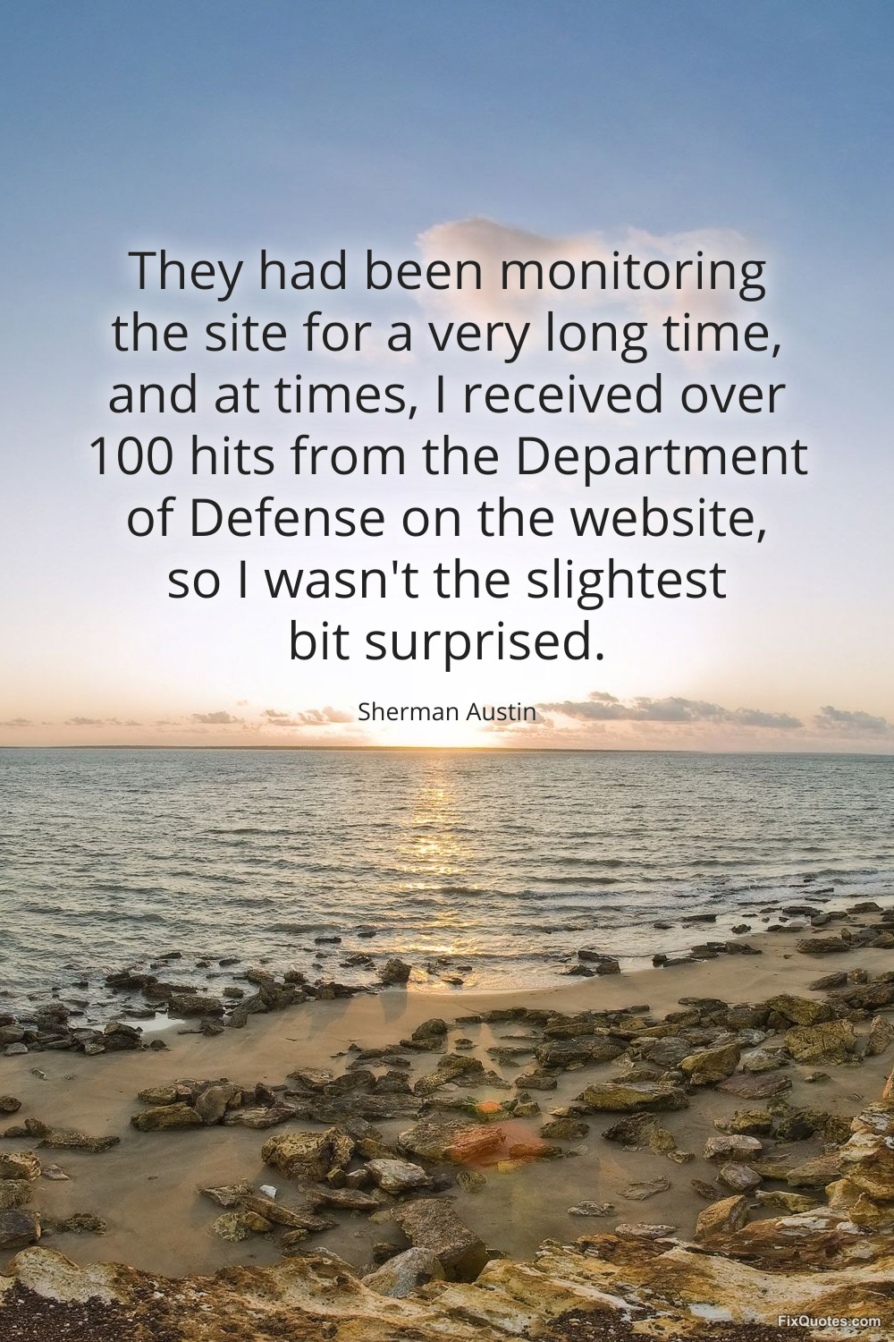 Austin, Sherman. (2026, January 15). They had been monitoring the site for a very long time, and at times, I received over 100 hits from the Department of Defense on the website, so I wasn't the slightest bit surprised. FixQuotes. https://fixquotes.com/quotes/they-had-been-monitoring-the-site-for-a-very-long-170453/