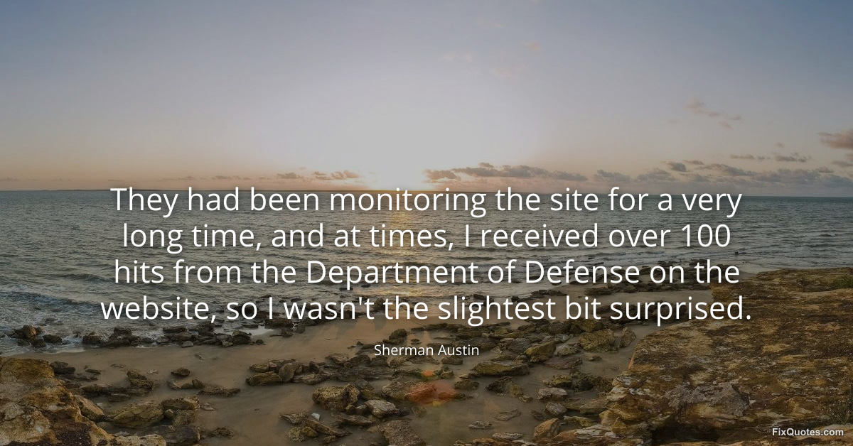 Austin, Sherman. "They had been monitoring the site for a very long time, and at times, I received over 100 hits from the Department of Defense on the website, so I wasn't the slightest bit surprised." FixQuotes. January 15, 2026. https://fixquotes.com/quotes/they-had-been-monitoring-the-site-for-a-very-long-170453/.