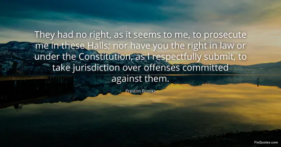 Brooks, Preston. (2026, January 16). They had no right, as it seems to me, to prosecute me in these Halls; nor have you the right in law or under the Constitution, as I respectfully submit, to take jurisdiction over offenses committed against them. FixQuotes. https://fixquotes.com/quotes/they-had-no-right-as-it-seems-to-me-to-prosecute-96582/