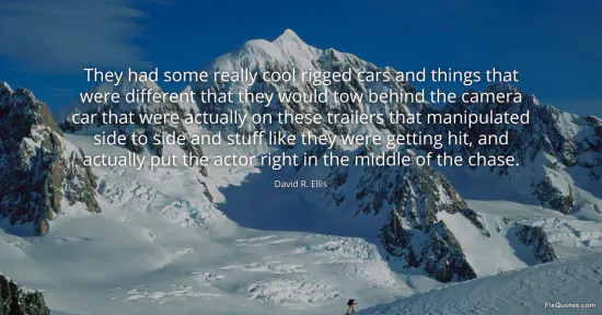 Ellis, David R. "They had some really cool rigged cars and things that were different that they would tow behind the camera car that were actually on these trailers that manipulated side to side and stuff like they were getting hit, and actually put the actor right in the middle of the chase." FixQuotes. January 15, 2026. https://fixquotes.com/quotes/they-had-some-really-cool-rigged-cars-and-things-144589/.