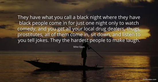 Epps, Mike. (2026, January 15). They have what you call a black night where they have black people come in for just one night only to watch comedy, and you get all your local drug dealers, thugs, prostitutes, all of them come in, sit down, and listen to you tell jokes. They the hardest people to make laugh. FixQuotes. https://fixquotes.com/quotes/they-have-what-you-call-a-black-night-where-they-156866/