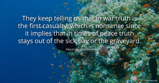 Cockburn, Alexander. "They keep telling us that in war truth is the first casualty, which is nonsense since it implies that in times of peace truth stays out of the sick bay or the graveyard." FixQuotes. January 16, 2026. https://fixquotes.com/quotes/they-keep-telling-us-that-in-war-truth-is-the-113539/.