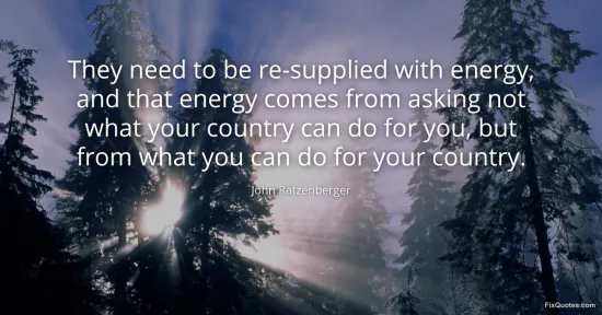 Ratzenberger, John. "They need to be re-supplied with energy, and that energy comes from asking not what your country can do for you, but from what you can do for your country." FixQuotes. January 17, 2026. https://fixquotes.com/quotes/they-need-to-be-re-supplied-with-energy-and-that-67436/.