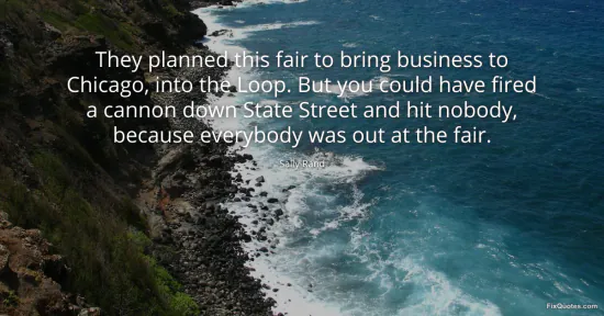 Rand, Sally. "They planned this fair to bring business to Chicago, into the Loop. But you could have fired a cannon down State Street and hit nobody, because everybody was out at the fair." FixQuotes. February 16, 2026. https://fixquotes.com/quotes/they-planned-this-fair-to-bring-business-to-128265/.