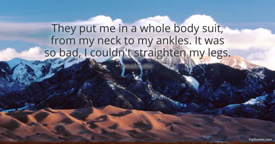 "They put me in a whole body suit, from my neck to my ankles. It was so bad, I couldn't straighten my legs." FixQuotes, 16 Jan. 2026, https://fixquotes.com/quotes/they-put-me-in-a-whole-body-suit-from-my-neck-to-99699/. Accessed 13 Feb. 2026.
