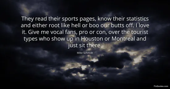 Schmidt, Mike. "They read their sports pages, know their statistics and either root like hell or boo our butts off. I love it. Give me vocal fans, pro or con, over the tourist types who show up in Houston or Montreal and just sit there." FixQuotes. January 16, 2026. https://fixquotes.com/quotes/they-read-their-sports-pages-know-their-122283/.