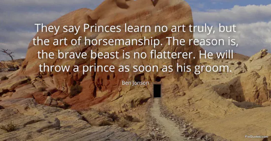 Jonson, Ben. "They say Princes learn no art truly, but the art of horsemanship. The reason is, the brave beast is no flatterer. He will throw a prince as soon as his groom." FixQuotes. February 15, 2026. https://fixquotes.com/quotes/they-say-princes-learn-no-art-truly-but-the-art-64050/.