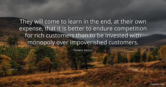 Bastiat, Frederic. (2026, January 15). They will come to learn in the end, at their own expense, that it is better to endure competition for rich customers than to be invested with monopoly over impoverished customers. FixQuotes. https://fixquotes.com/quotes/they-will-come-to-learn-in-the-end-at-their-own-170027/