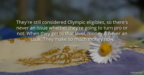Hamill, Dorothy. (2026, January 16). They're still considered Olympic eligibles, so there's never an issue whether they're going to turn pro or not. When they get to that level, money is never an issue. They make so much money now. FixQuotes. https://fixquotes.com/quotes/theyre-still-considered-olympic-eligibles-so-104370/