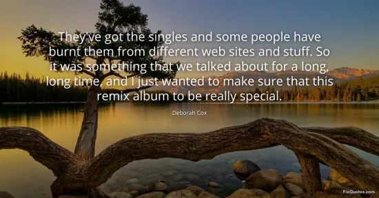 Cox, Deborah. "They've got the singles and some people have burnt them from different web sites and stuff. So it was something that we talked about for a long, long time, and I just wanted to make sure that this remix album to be really special." FixQuotes. January 17, 2026. https://fixquotes.com/quotes/theyve-got-the-singles-and-some-people-have-burnt-48756/.
