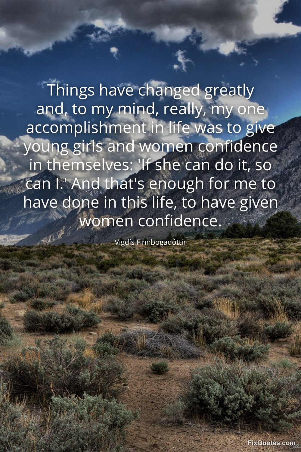 Finnbogadóttir, Vigdís. (2026, February 16). Things have changed greatly and, to my mind, really, my one accomplishment in life was to give young girls and women confidence in themselves: 'If she can do it, so can I.' And that's enough for me to have done in this life, to have given women confidence. FixQuotes. https://fixquotes.com/quotes/things-have-changed-greatly-and-to-my-mind-really-185410/