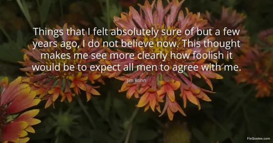 Rohn, Jim. "Things that I felt absolutely sure of but a few years ago, I do not believe now. This thought makes me see more clearly how foolish it would be to expect all men to agree with me." FixQuotes. January 17, 2026. https://fixquotes.com/quotes/things-that-i-felt-absolutely-sure-of-but-a-few-71965/.