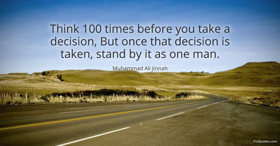 Jinnah, Muhammad Ali. (2026, January 15). Think 100 times before you take a decision, But once that decision is taken, stand by it as one man. FixQuotes. https://fixquotes.com/quotes/think-100-times-before-you-take-a-decision-but-143267/