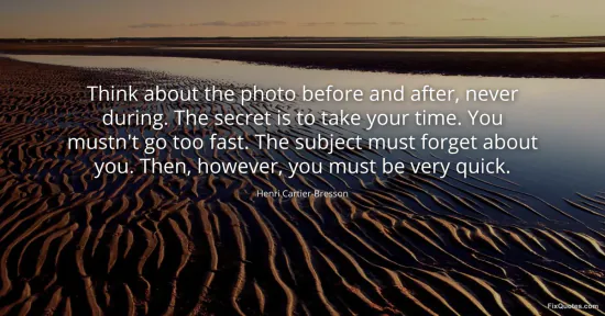 Cartier-Bresson, Henri. (2026, January 15). Think about the photo before and after, never during. The secret is to take your time. You mustn't go too fast. The subject must forget about you. Then, however, you must be very quick. FixQuotes. https://fixquotes.com/quotes/think-about-the-photo-before-and-after-never-148543/