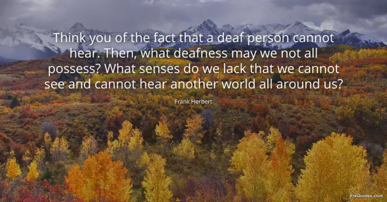 Herbert, Frank. (2026, February 9). Think you of the fact that a deaf person cannot hear. Then, what deafness may we not all possess? What senses do we lack that we cannot see and cannot hear another world all around us? FixQuotes. https://fixquotes.com/quotes/think-you-of-the-fact-that-a-deaf-person-cannot-95359/