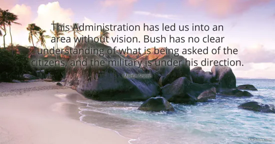 "This Administration has led us into an area without vision. Bush has no clear understanding of what is being asked of the citizens, and the military is under his direction." FixQuotes, 17 Jan. 2026, https://fixquotes.com/quotes/this-administration-has-led-us-into-an-area-57835/. Accessed 12 Feb. 2026.