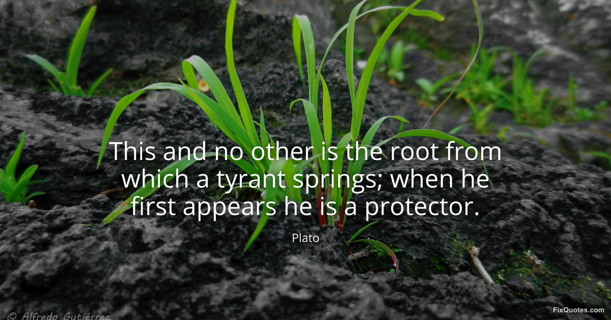 Plato. "This and no other is the root from which a tyrant springs; when he first appears he is a protector." FixQuotes. January 17, 2026. https://fixquotes.com/quotes/this-and-no-other-is-the-root-from-which-a-tyrant-29323/.