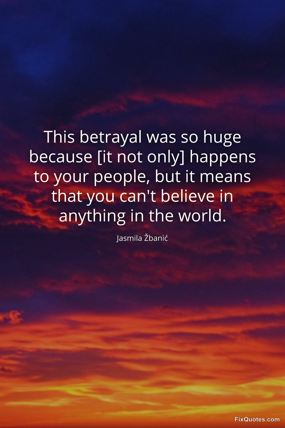 Žbanić, Jasmila. (2026, February 15). This betrayal was so huge because [it not only] happens to your people, but it means that you can't believe in anything in the world. FixQuotes. https://fixquotes.com/quotes/this-betrayal-was-so-huge-because-it-not-only-185397/