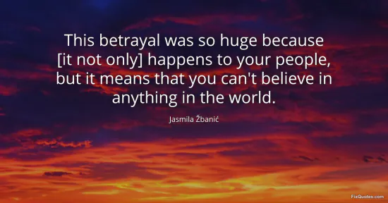 Žbanić, Jasmila. "This betrayal was so huge because [it not only] happens to your people, but it means that you can't believe in anything in the world." FixQuotes. February 15, 2026. https://fixquotes.com/quotes/this-betrayal-was-so-huge-because-it-not-only-185397/.