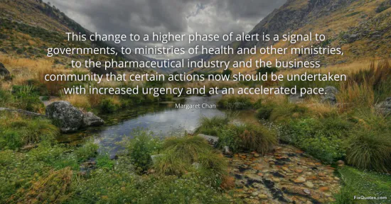 Chan, Margaret. (2026, January 15). This change to a higher phase of alert is a signal to governments, to ministries of health and other ministries, to the pharmaceutical industry and the business community that certain actions now should be undertaken with increased urgency and at an accelerated pace. FixQuotes. https://fixquotes.com/quotes/this-change-to-a-higher-phase-of-alert-is-a-161518/