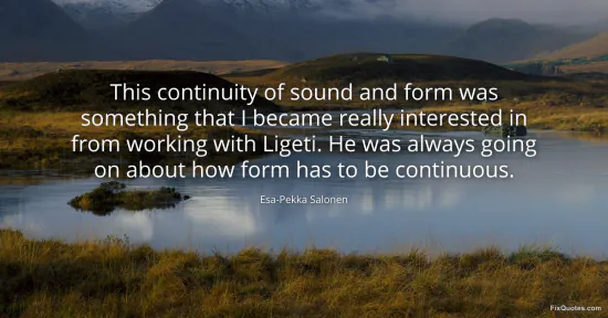 Salonen, Esa-Pekka. "This continuity of sound and form was something that I became really interested in from working with Ligeti. He was always going on about how form has to be continuous." FixQuotes. January 15, 2026. https://fixquotes.com/quotes/this-continuity-of-sound-and-form-was-something-140638/.