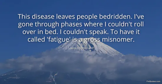 Hillenbrand, Laura. "This disease leaves people bedridden. I've gone through phases where I couldn't roll over in bed. I couldn't speak. To have it called 'fatigue' is a gross misnomer." FixQuotes. January 16, 2026. https://fixquotes.com/quotes/this-disease-leaves-people-bedridden-ive-gone-99723/.