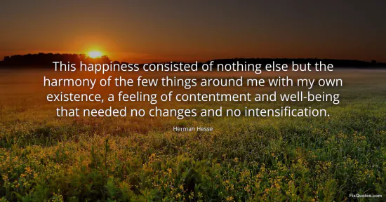 Hesse, Herman. "This happiness consisted of nothing else but the harmony of the few things around me with my own existence, a feeling of contentment and well-being that needed no changes and no intensification." FixQuotes. January 15, 2026. https://fixquotes.com/quotes/this-happiness-consisted-of-nothing-else-but-the-50742/.