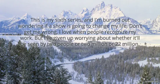 Ross, Charlotte. "This is my sixth series, and I'm burned out wondering if a show is going to change my life. Don't get me wrong, I love when people recognize my work. But I've given up worrying about whether it'll be seen by two people or two million or 22 million." FixQuotes. January 17, 2026. https://fixquotes.com/quotes/this-is-my-sixth-series-and-im-burned-out-40021/.