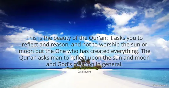 Stevens, Cat. "This is the beauty of the Qur'an: it asks you to reflect and reason, and not to worship the sun or moon but the One who has created everything. The Qur'an asks man to reflect upon the sun and moon and God's creation in general." FixQuotes. January 18, 2026. https://fixquotes.com/quotes/this-is-the-beauty-of-the-quran-it-asks-you-to-12700/.
