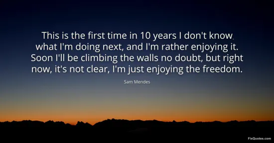 Mendes, Sam. "This is the first time in 10 years I don't know what I'm doing next, and I'm rather enjoying it. Soon I'll be climbing the walls no doubt, but right now, it's not clear, I'm just enjoying the freedom." FixQuotes. January 17, 2026. https://fixquotes.com/quotes/this-is-the-first-time-in-10-years-i-dont-know-24674/.