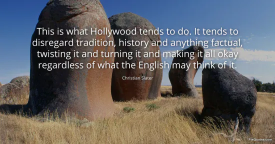 Slater, Christian. "This is what Hollywood tends to do. It tends to disregard tradition, history and anything factual, twisting it and turning it and making it all okay regardless of what the English may think of it." FixQuotes. January 17, 2026. https://fixquotes.com/quotes/this-is-what-hollywood-tends-to-do-it-tends-to-43074/.