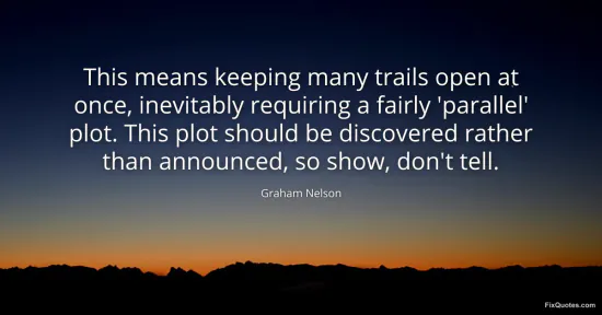 Nelson, Graham. "This means keeping many trails open at once, inevitably requiring a fairly 'parallel' plot. This plot should be discovered rather than announced, so show, don't tell." FixQuotes. January 18, 2026. https://fixquotes.com/quotes/this-means-keeping-many-trails-open-at-once-19605/.