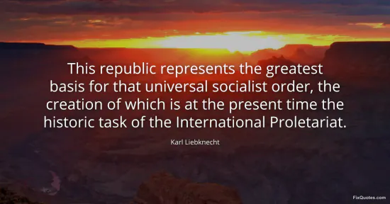 Liebknecht, Karl. "This republic represents the greatest basis for that universal socialist order, the creation of which is at the present time the historic task of the International Proletariat." FixQuotes. January 16, 2026. https://fixquotes.com/quotes/this-republic-represents-the-greatest-basis-for-85994/.