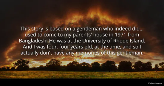 Lahiri, Jhumpa. "This story is based on a gentleman who indeed did... used to come to my parents' house in 1971 from Bangladesh. He was at the University of Rhode Island. And I was four, four years old, at the time, and so I actually don't have any memories of this gentleman." FixQuotes. January 17, 2026. https://fixquotes.com/quotes/this-story-is-based-on-a-gentleman-who-indeed-did-55932/.